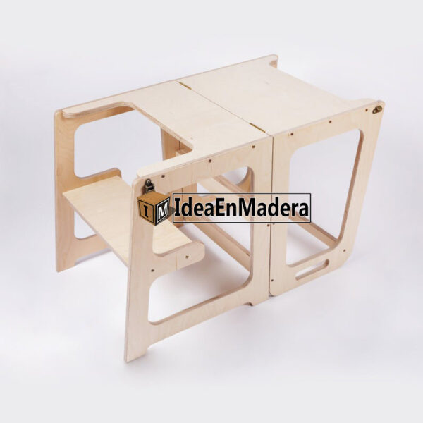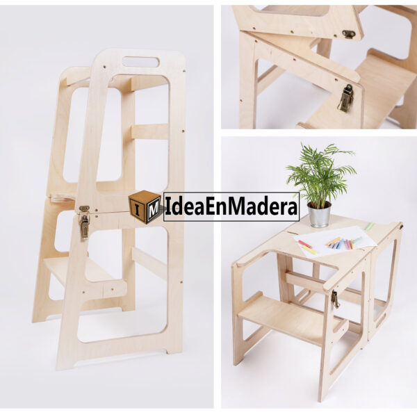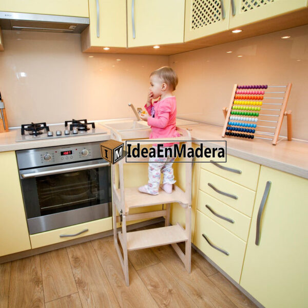Banco infantil de ayuda, se transforma en mesita. Para que los pequeños puedan ayudar en la cocina de una forma segura.